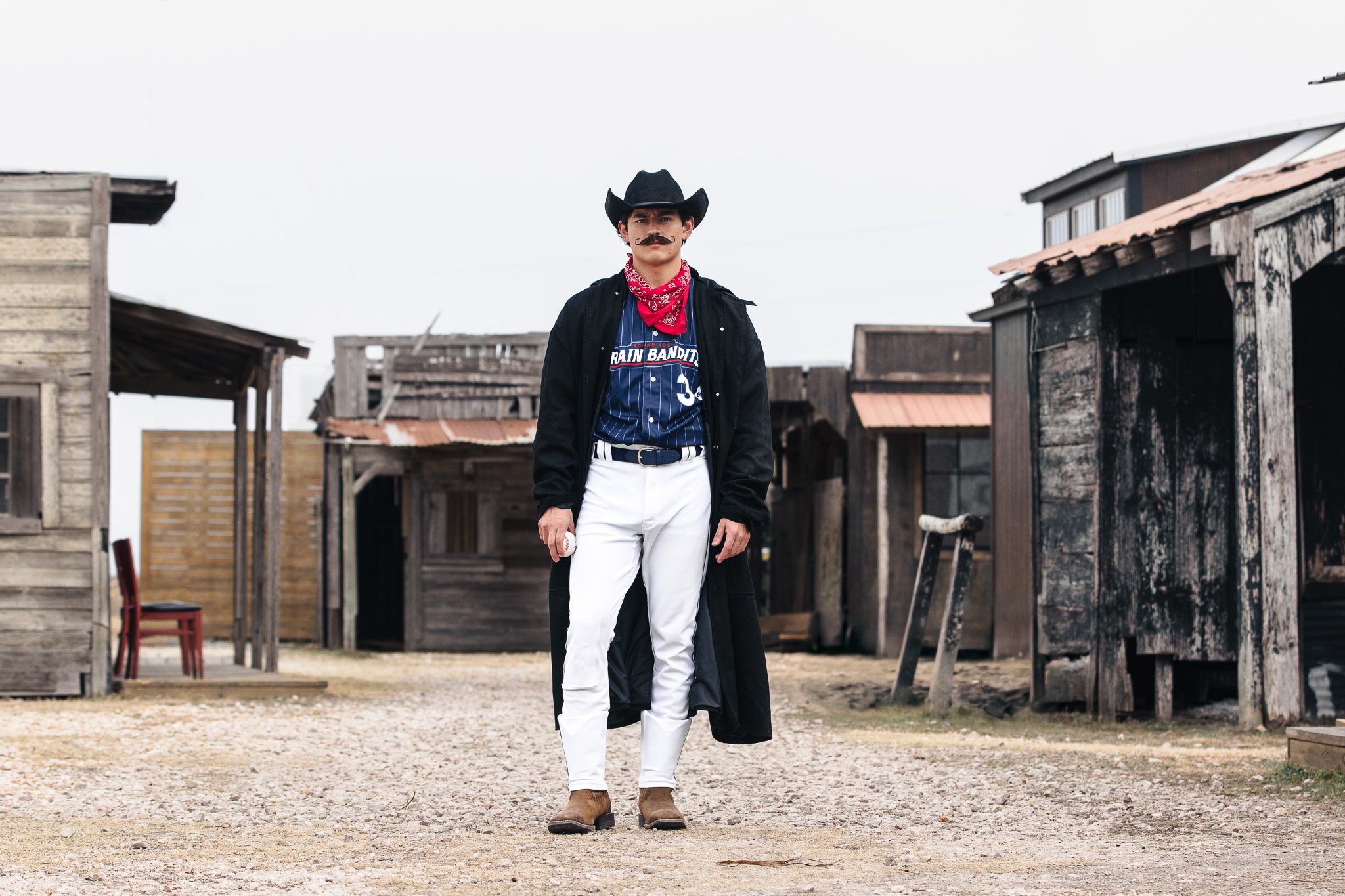 The final designs feature a rugged depiction of Sam Bass biting a gold coin with his eyes covered, securing the identity’s ambiguity, paired with a custom Western wordmark.